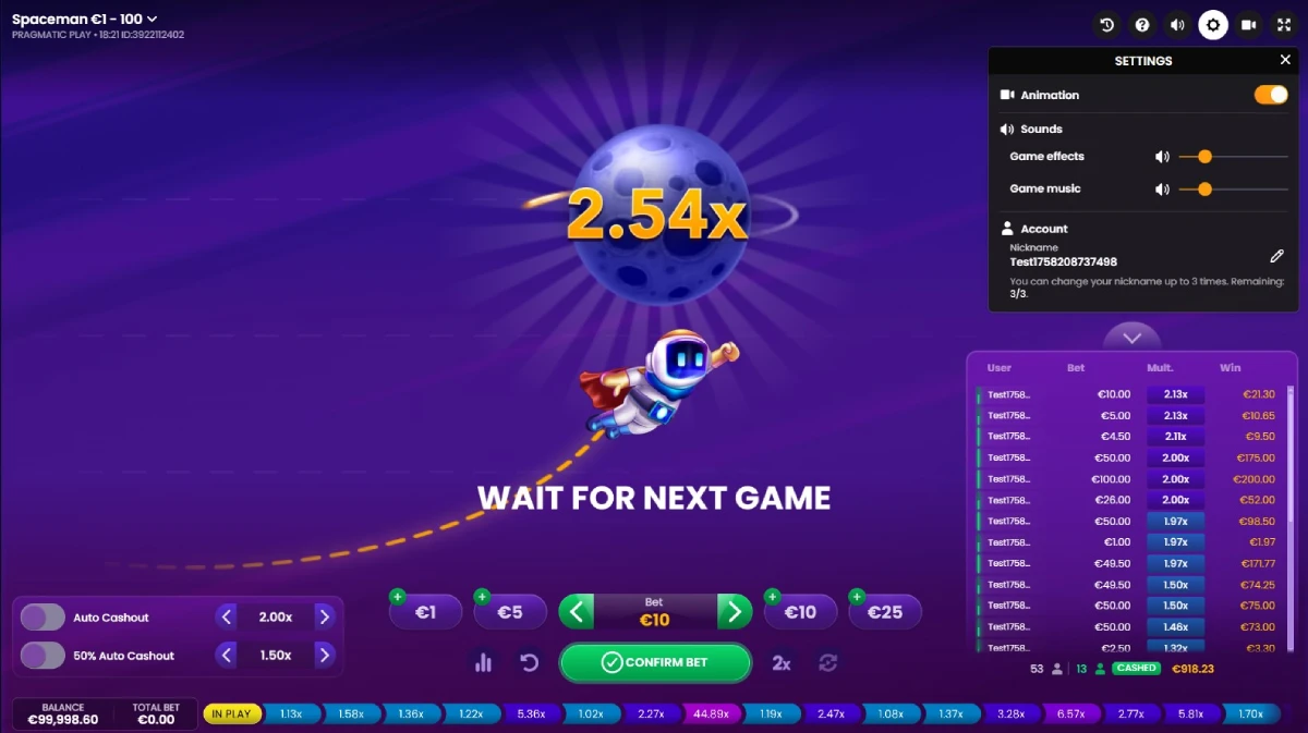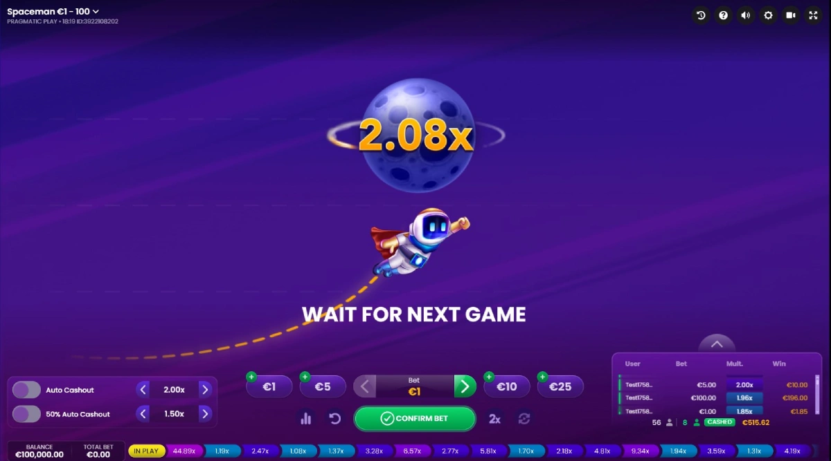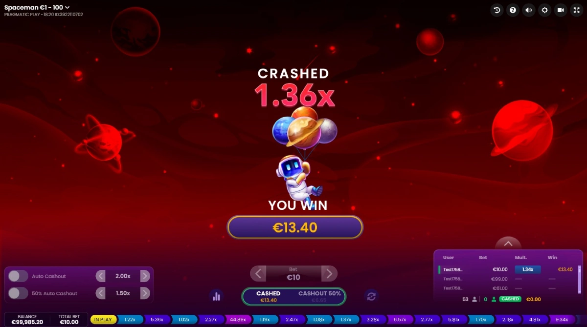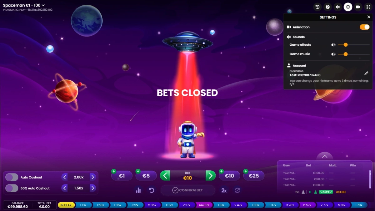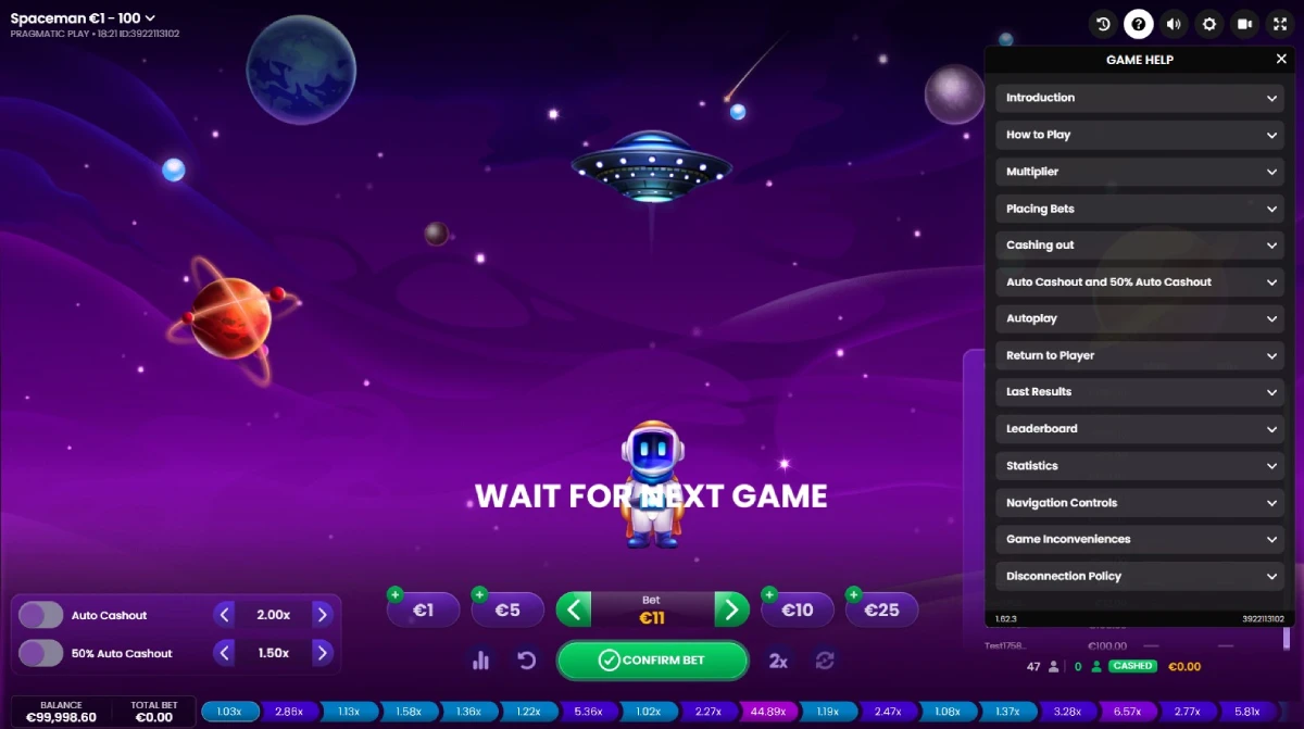 Как играть в Spaceman? Каждый раунд стартует с коэффициента 1.00x и почти сразу уходит выше единицы. У вас есть две опции: забрать весь выигрыш целиком или воспользоваться частичным выводом — тем самым cashout 50%. Вторая опция и отличает игру от десятков похожих: можно «спасти» половину суммы и дать оставшейся части ставки «лететь» дальше, рассчитывая на более высокий множитель. В реальной игре это часто выглядит так: вы забираете половину на сравнительно безопасном уровне (например, около 1.4–1.8x), а остальное оставляете «на удачу» — вдруг раунд протянет до 2x и выше.